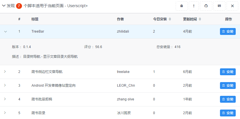 Userscript+: 显示当前网站所有可用的UserJS脚本:当我们浏览网页时,会在右下角显示适合当前网站的所有可用脚本,点击可以查看脚本介绍,并且一键安装。